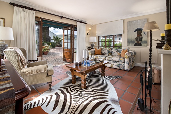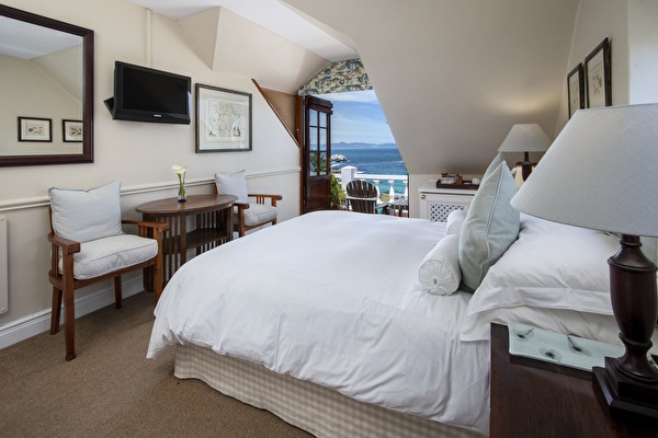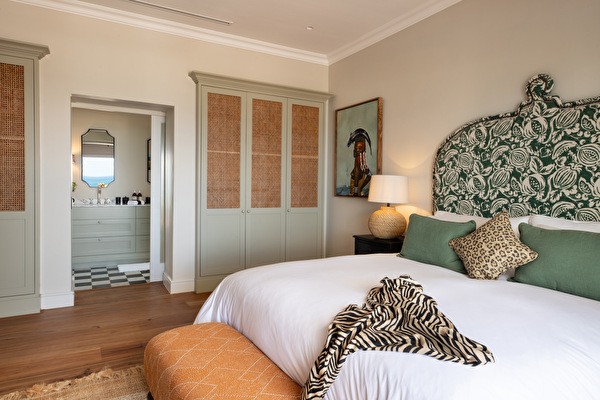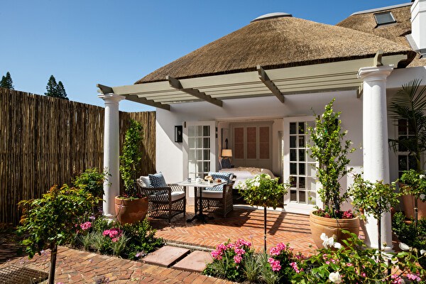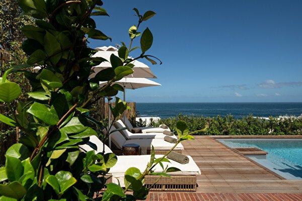 This elegant room at La Fontaine Lodge offers a breathtaking view over the Atlantic Ocean and features a comfortable king-size bed, an ensuite bathroom, and a private outdoor sitting area next to the pool.